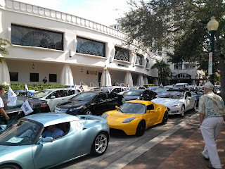 The fun really started when 60 electric cars participated in a "silent EV parade," led by a police escort, from downtown Sarasota over a scenic bridge to one of our beautiful barrier islands, all donning special "National Plug In Day" flags attached to their vehicles. It was a sight to see (but not hear)!