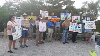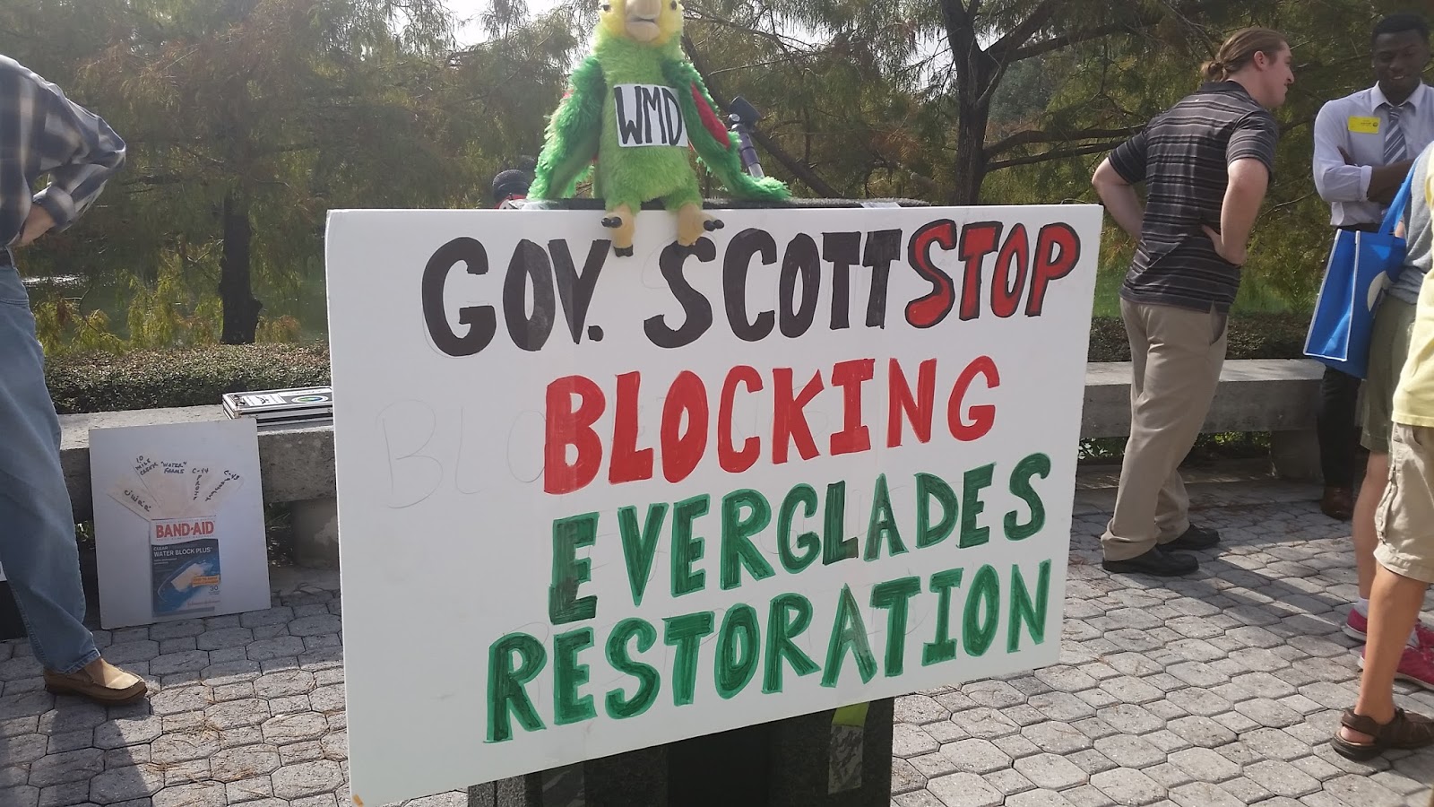 Some protesters’ signs read: Governor Scott, Stop Blocking Everglades Restoration, No Dirty Water to