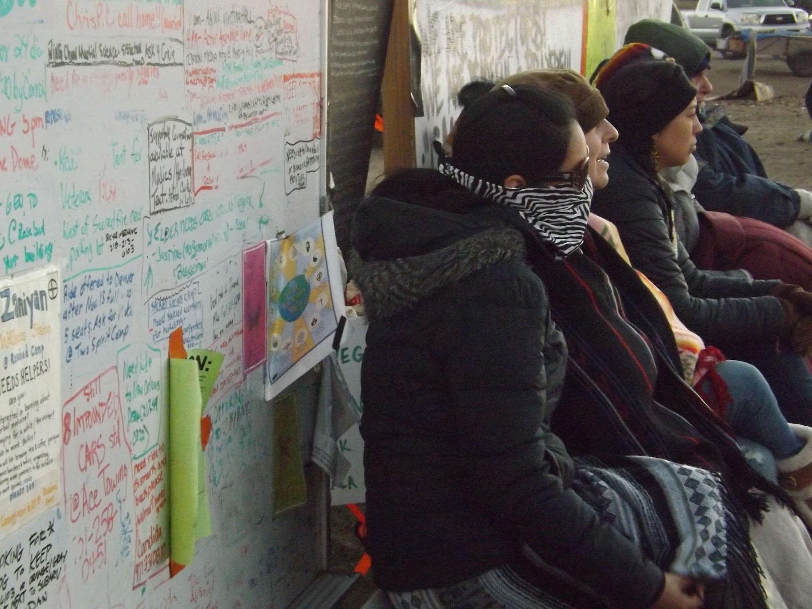 The youth, with the support of elders, co-ordinated many of the direct actions and resistance in camp. Their creativity in the strategies they devised was nothing short of brilliant. Actions like trying to stop pipeline work by walking the easement and obstructing machines, creating ceremony alongside a railroad track which slowed down the train delivering materials for the drilling platform, to gathering in prayer and ceremony outside of the Bismarck Wells Fargo which is one of the money lenders, to going to the DAPL headquarters to pray and do ceremony, or organizing 600 people to form a human medicine wheel on the banks of the river for aerial photography. These were the actions taking place when I was in camp, but everyday these talented young people create new and different actions.